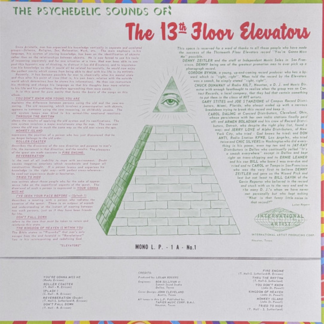 The Psychedelic Sounds Of The 13th Floor Elevators (1966) არის ჯგუფის სადებიუტო ალბომი და ფსიქოდელიური როკის საძირკვლად მიჩნეული ნამუშევარი. ალბომი აერთიანებს ენერგიულ გარაჟ-როკს, ცნობიერების გაფართოებაზე ორიენტირებულ ტექსტებს და ექსპერიმენტულ ხმოვან მიდგომებს. მისი ჟღერადობა უხეში და პირდაპირია, მაგრამ ამავე დროს ატმოსფერული და ტრანსული, რაც მას დღემდე აქტუალურ და გავლენიან ჩანაწერად აქცევს.