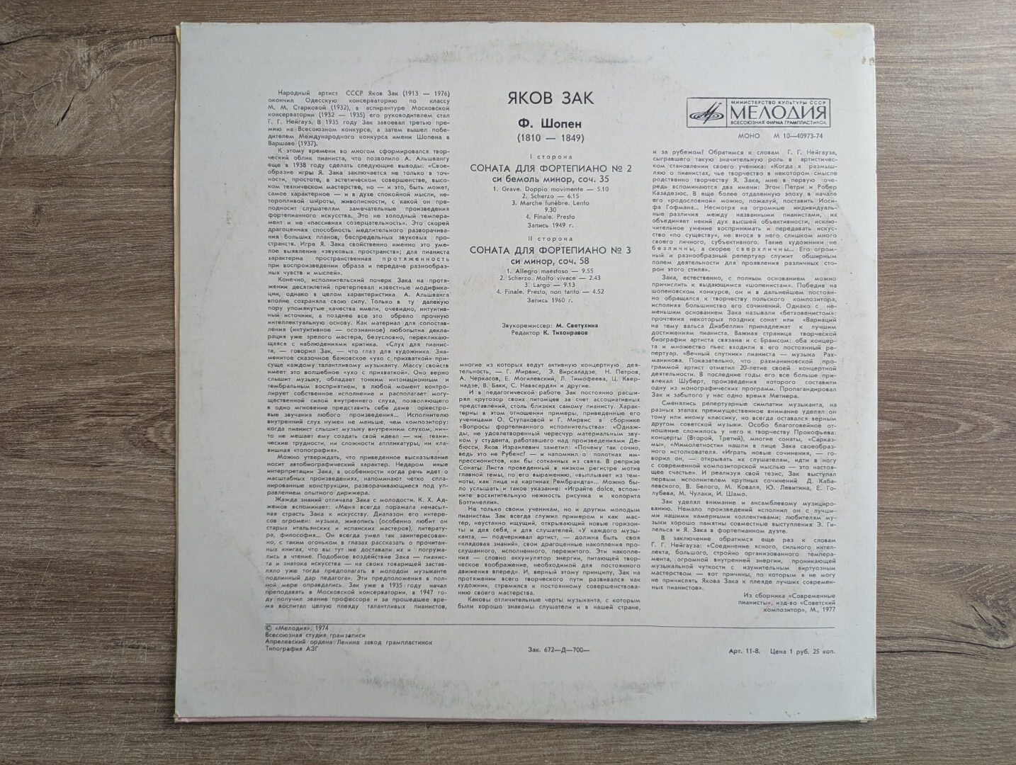 იაკოვ ზაკი (Yakov Zak) – გამოჩენილი საბჭოთა პიანისტი და პედაგოგი, რომლის შესრულებები გამოირჩევა ინტელექტუალური სიღრმით, სტრუქტურული სიზუსტითა და მაღალი პროფესიონალიზმით. “Piano Sonatas No. 2 and No. 3” აერთიანებს შოპენის ორ ყველაზე მნიშვნელოვან საფორტეპიანო სონატას. სონატა №2 განსაკუთრებით ცნობილია თავისი „სამგლოვიარო მარშით“, ხოლო №3 წარმოადგენს კომპოზიტორის გვიანი პერიოდის სრულყოფილ და მასშტაბურ ნამუშევარს.