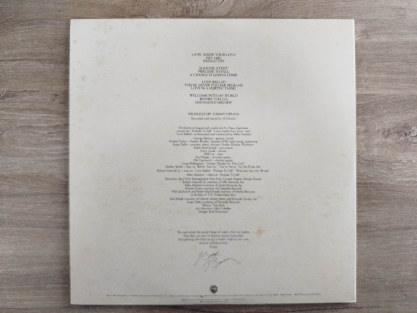 ალბომი მოიცავს როგორც ინსტრუმენტულ კომპოზიციებს, სადაც ბენსონის გიტარა მთავარი როლს თამაშობს, ასევე ვოკალურ ბალადებს, რომლებიც მის უნიკალურ შესრულების მანერას კიდევ უფრო მეტად გამოკვეთს. Livin’ Inside Your Love შესანიშნავი ნამუშევარია, რომელიც ამტკიცებს ბენსონის როგორც ვირტუოზი გიტარისტისა და ნაზი მელოდიების დიდოსტატის სტატუსს. გასაყიდი ალბომის ვინილი და ყდა შესანიშნავ მდგომარეობაშია.