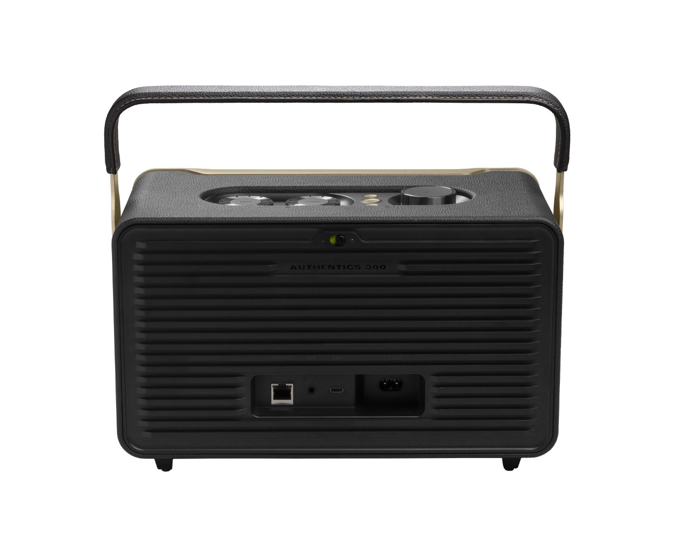 JBL Authentics 300 – არის რეტრო სტილის პორტაბელური სპიკერი, რომელიც ნებისმიერ სივრცეს ავსებს უმაღლესი ხარისხის სტერეო ჟღერადობით. მისი 1-ინჩიანი ტვიტერები, 5.25-ინჩიანი ვუფერი და 6.5-ინჩიანი პასიური რადიატორი უზრუნველყოფს იდეალურ ბალანსს დეტალიზაციასა და ღრმა ბასებს შორის. მოწყობილობა გამოირჩევა კლასიკური დიზაინით, ალუმინის სახელურით და რელიეფური კუბიკისებრი ზედაპირით, ხოლო ჩაშენებული ბატარეა 8 საათამდე მუშაობას სთავაზობს მომხმარებელს. სპიკერი ავტომატურად ითვლის გარემო პირობებს და ახდენს ხმის ოპტიმიზაციას ყოველი ჩართვისას. Wi-Fi კავშირით ხელმისაწვდომია AirPlay, Chromecast და Spotify Connect, რაც მუსიკის შეუფერხებელ სტრიმინგს უზრუნველყოფს. განსაკუთრებული ფუნქციაა Google Assistant-ისა და Amazon Alexa-ს ერთდროული მხარდაჭერა, რაც სმარტ-სახლის მართვას კიდევ უფრო ამარტივებს. პარამეტრების მორგება შესაძლებელია როგორც კორპუსზე არსებული ღილაკებით, ისე JBL One აპლიკაციით. გარდა ამისა, მოწყობილობა ეკომეგობრულია, დამზადებულია რეციკლირებული მასალებისგან და საშუალებას გაძლევთ შექმნათ Multi-Room სისტემა სხვა JBL Authentics სპიკერებთან დაკავშირებით.