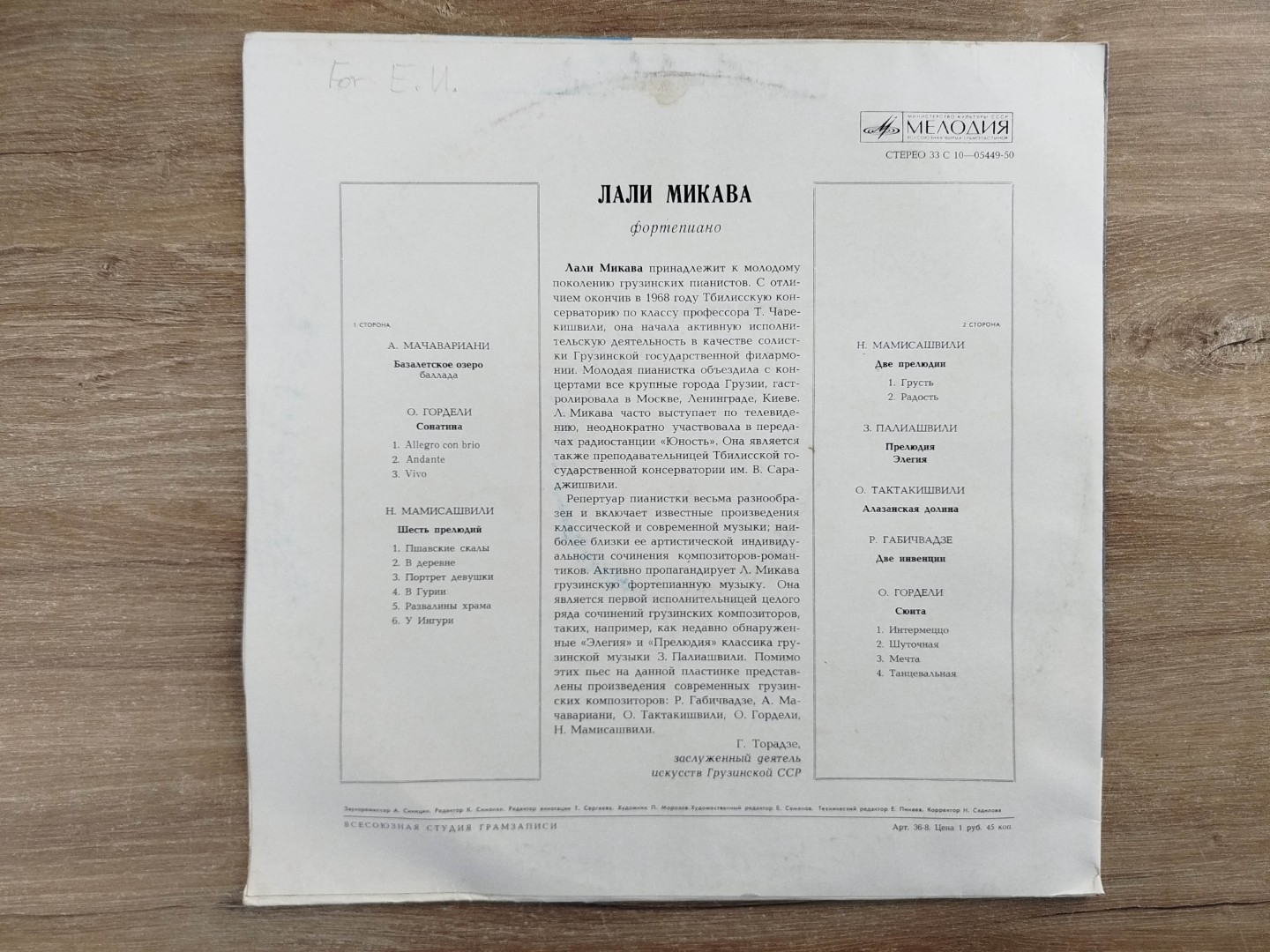 ცნობილი ქართველი პიანისტის, ლალი მიქავას, მიერ შესრულებული ქართველი კომპოზიტორების ნაწარმოებები. კომპოზიტორებს შორის არიან: ალექსი მაჭავარიანი, ზაქარია ფალიაშვილი და სხვა. გასაყიდი ვინილი წარმოადგენს ერთ – ერთ იშვიათ ეგზემპლარს. ვინილის ფირფიტაც და ყდაც ორივე იდეალურ მდგომარეობაშია.