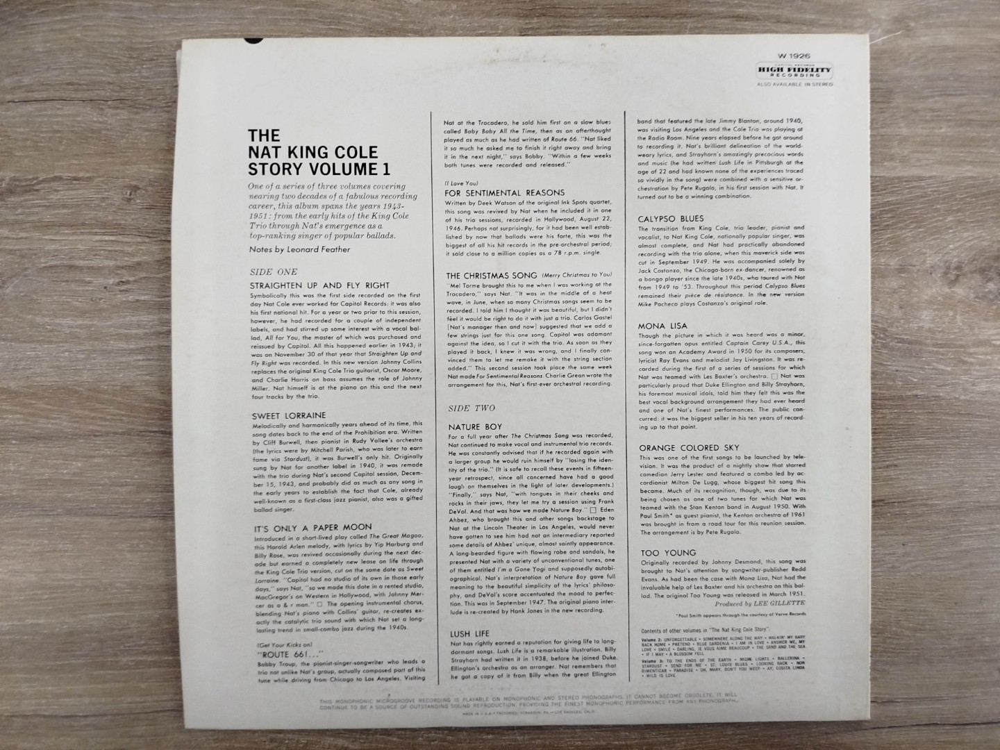 „The Nat King Cole Story“ (1961) არის მისი ყველაზე ცნობილი კომპოზიციების ხელახლა ჩაწერილი კრებული, შესრულებული თანამედროვე სტუდიური ხარისხით და ორკესტრალური გაფორმებით. ვინილი გამოცემულია ამერიკაში და შესანიშნავად არის შენახული.