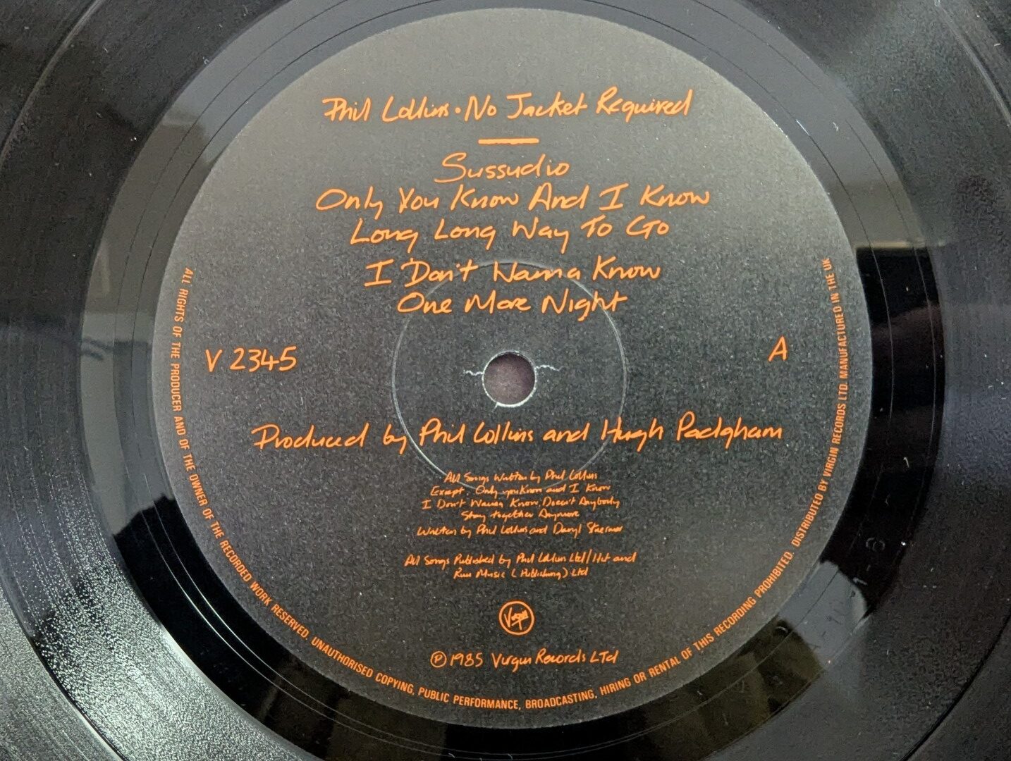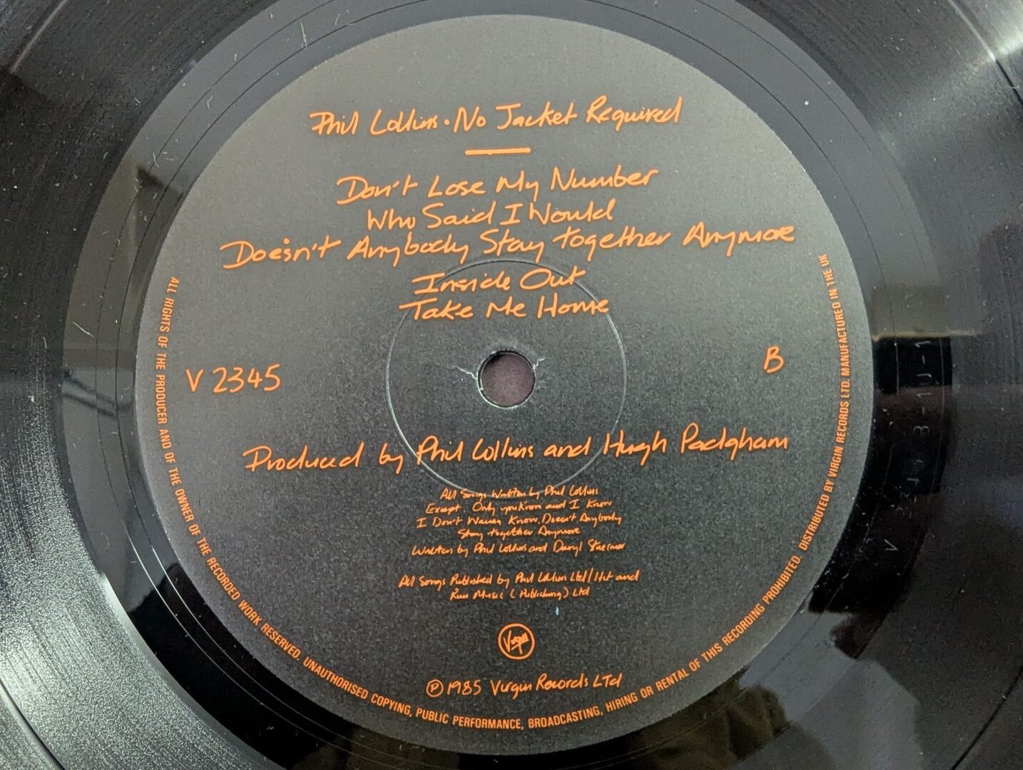 ალბომი No Jacket Required გამოვიდა 1985 წელს და გახდა Collins-ის ერთ-ერთი ყველაზე წარმატებული და გავლენიანი ნამუშევარი. გასაყიდი ვინილი წარმოადგენს 1985 წლის ბრიტანულ გამოცემას. ვინილის ფირფიტაც და ყდაც ძალიან კარგ მდგომარეობაშია.